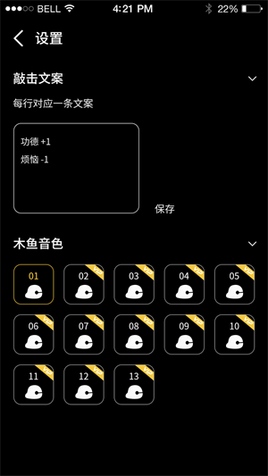 - 自定义设置你的木鱼敲击内容,可以进行敲击文案设置、木鱼音色设置等,根据自己的需求自定义;