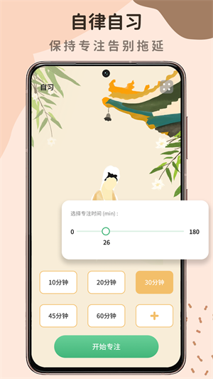 - 带来正计时、倒计时服务可以设置,自定义设置专注界面的背景,一键点击开启学霸模式,专注学习;