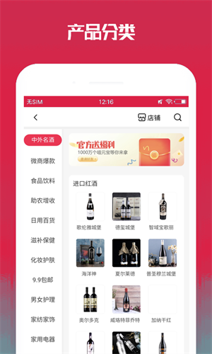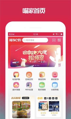 2、【喵家e购软件栏目】日用百货、食品饮料、家纺家饰、中外名酒、助农增收、男女护理、化妆护肤、家用电器、滋补保健;
