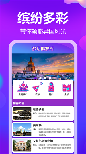 - 对于有计划去俄罗斯旅游的用户,还有关于俄罗斯著名景点及旅游胜地及地特产的介绍,方便用户更好的了解。