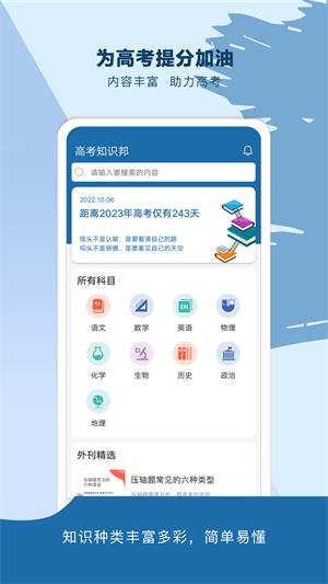 1、高考知识邦,高考备考提分,涵盖高考语文、高考数学、高考英语、高考物理、高考化学、高考生物、高考历史、高考政治、高考地理九大科目的知识点分类详解;
