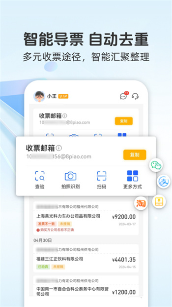 - 轻松完成发票数据的瞳距,所有消费、属性、类型的统计完成统计,告别手工分析的难题。