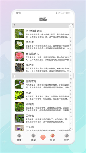- 全面的植物百科图鉴在线学习,每一个植物的百科知识提供,根据首字母大写来快速找到自己感兴趣的;