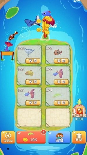 在游戏里面只需要不断的购买鱼就可以去完成了,我们可以随时的在游戏里面快速的体验到合成的乐趣。