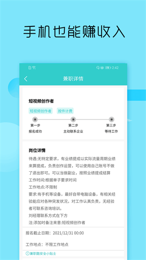 - 专为手机兼职打造的找工作平台,适合每个小伙伴在线找兼职任务,随时随地寻找兼职工作赚钱;