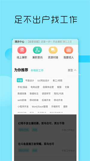 - 覆盖了多个行业的兼职工作,适合每个小伙伴在线便捷操作,体验到轻松的手机兼职、找工作体验。