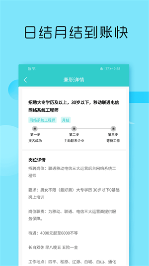 - 带来日结、月结服务,每天都能轻松兼职找工作,适合每个小伙伴,各行业的兼职工作全都有;