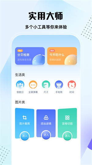 实用大师是手机上的工具箱应用,汇聚了众多类型的工具给大家挑选,包含了多样类型、用途的工具,可以大大提高大家的做事效率,都是简单操作就能快速上手使用,感受到超便捷舒适的服务,让大家的生活更加享受、更加的便捷。