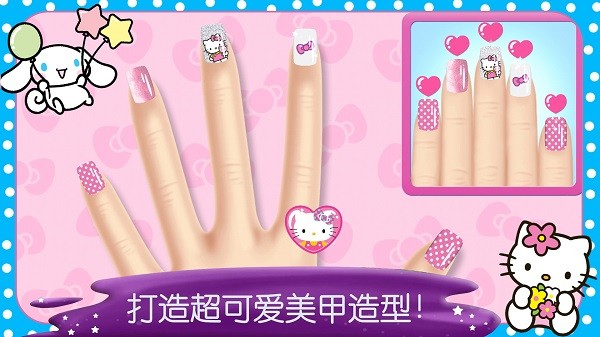 是美甲设计玩法的游戏,以凯蒂猫为主题,根据手指甲的大小调整上面的各种小贴纸,能设计美甲的形状,完成更多时尚造型的设定,展现出自己出色的设计能力。