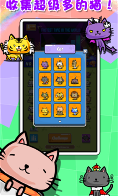 游戏操作简单但难度较大,沉浸式的背景音乐让玩家可以打法闲暇时光,每次点击方块都可以获得互动,但有着些许难度,每次进行挑战都要考虑后面怎么消除,成功通关就可以获得猫猫,加入世界排名,让你也能留下浓厚的一笔。