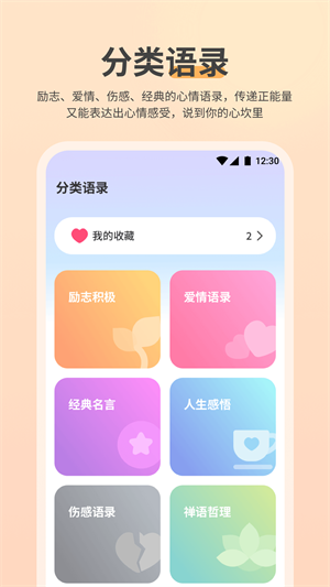 - 详细的分类让语录的查找更加的便捷,励志、爱情、伤感、经典等心情语录任你挑选,一键收藏喜欢的。