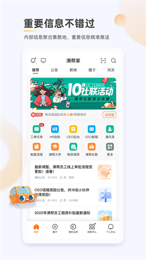1、通知公告、新闻中心、制度流程、圈子、CEO信箱等各类信息集散,保证内部信息的即时触达,打通内部信息的上下传递通道,实现管理信息的上传下达,员工心声的下情上达;