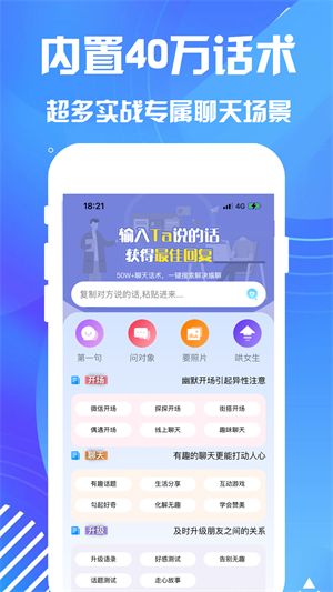 - 输入对方的话,即可输出多种巧妙回复,支持一键复制,不同场景的见面聊天聊天技巧应有尽有;