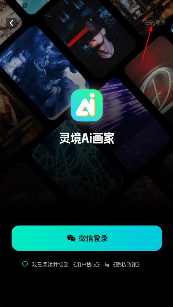 1、打开灵境AI画家APP,点击密码登录,进入密码登录界面。