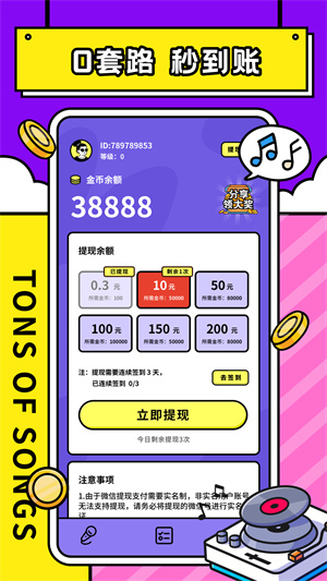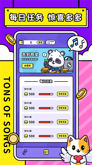 猜歌达人赚钱里面的各种音乐资源都是热门和流行的歌曲,大家也可以轻松的进行猜歌,还可以做任务和每日签到来赚取很多的零花钱。