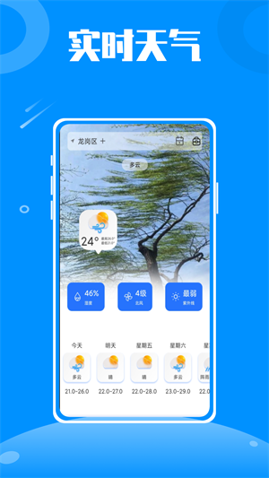 1、【定位城市的实时天气】从湿度、风向和紫外线进行分析,以及未来一周的天气,都能预知;