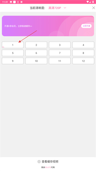 3、在缓存界面中,确认当前清晰度,同时选择想要缓存的剧集集数点击即可。