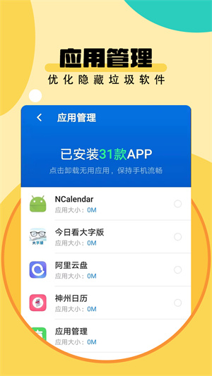 - 可以对手机的存储空间和内存空间进行管理和清洁,让您的手机系统运行更加顺畅;