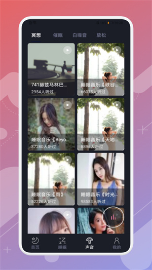2、专注减压放松新方式,用自然之声、轻音乐、睡前故事、冥想等方式改善你的睡眠、调节情绪、缓解焦虑与压力;