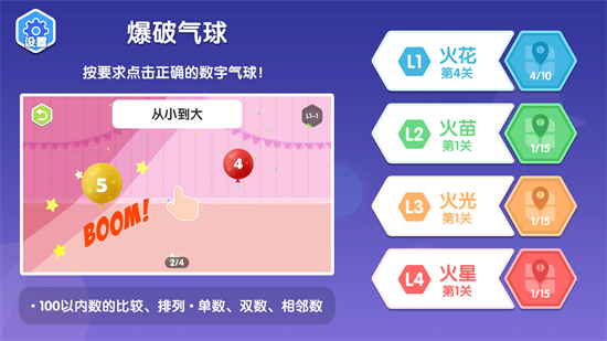 爆破气球是连接幼儿数学启蒙早教数学课程产品的学前数学启蒙数学游戏,通过科学的安排,让孩子在轻松的游戏中逐渐锻炼自己的快速反应能力和缜密思考能力。