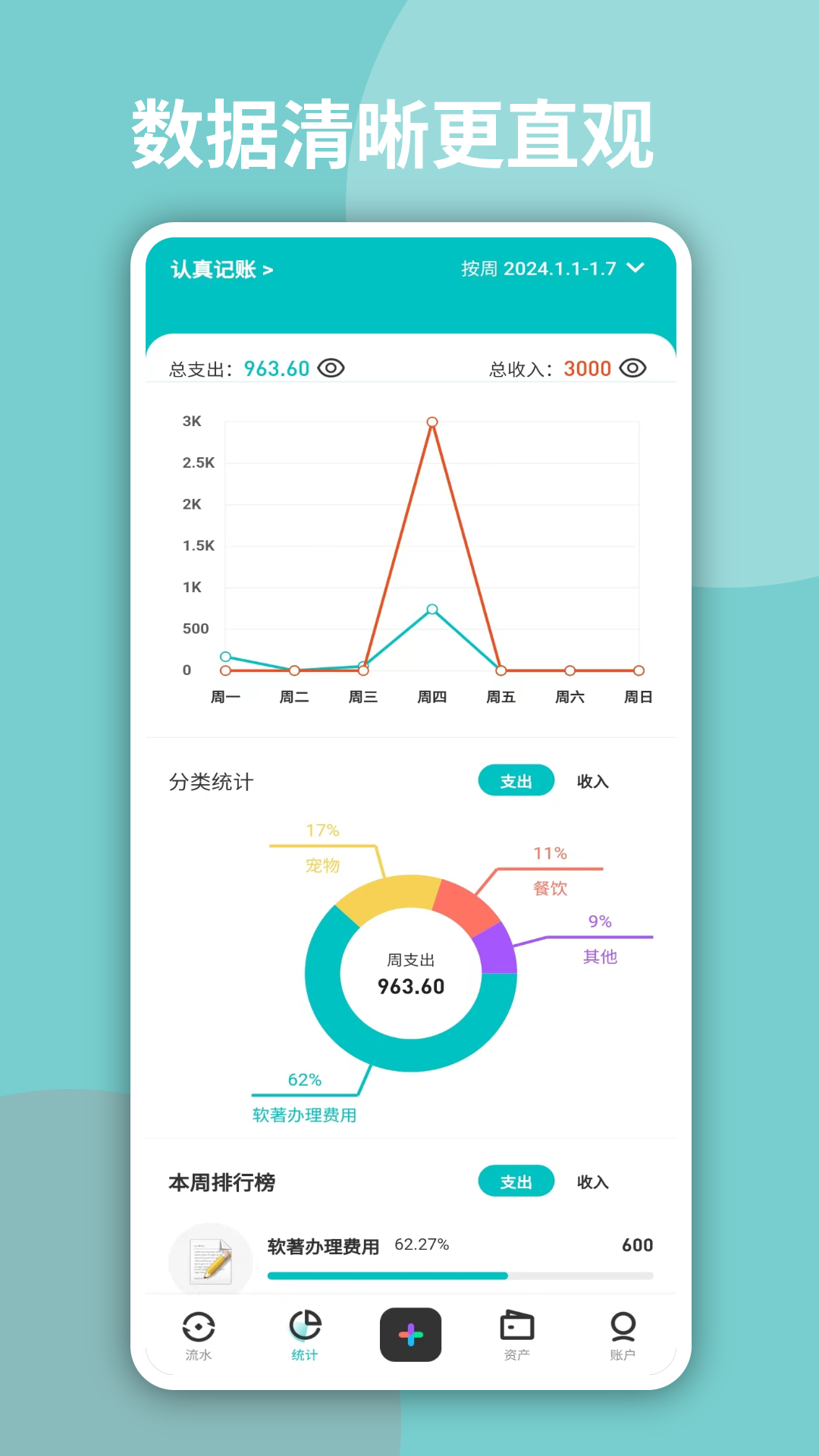 2、清晰流水:通过首页日流水、周流水、月流水、年流水,一目了然;