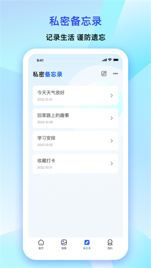 - 体验私密备忘录服务,每一个备忘录添加密码保护,所有的信息无需担心会泄露。