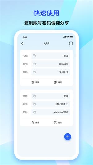 - 专为账号密码记录打造,大家可以在这里记录自己的账号密码,避免遗忘;