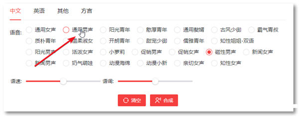 1、输入文字然后选择下方的语言、语音、语速、语调,就可以进行合成;