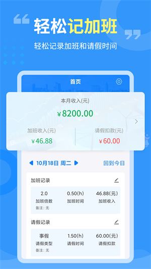 - 轻松记录你的加班和请假时间,根据加班和请假情况,自动计算本月工资收入;