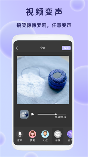 1、视频变声:选择您手机本地需要变声的视频,点击APP功能区下方的变声选项,包括:原声、萝莉、大叔、惊悚、搞笑、空灵、混音,多个视频变声功能,让您的视频声音百变好玩,快来试试吧;
