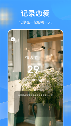 - 加入纪念日记录助手,设置日期开启倒数日纪念,还有情人节等节假日的提醒。