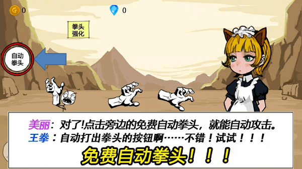 疯狂的拳头一款冒险文字游戏,控制你的拳头不断增加一些属性,挑战敌人疯狂升级,成为最强拳王,更多BOSS挑战,完成你的关卡,丰富的文字情节给玩家带来了爆笑的挑战,你可以随时战斗,体验更精彩的对决,您可以控制拳头进行决斗,也可以与当地人作战。