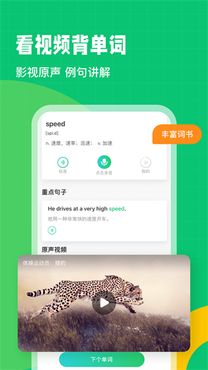 - 观看视频背诵单词,让大家可以掌握更多的英语单词,还有影视原声带来例句讲解;
