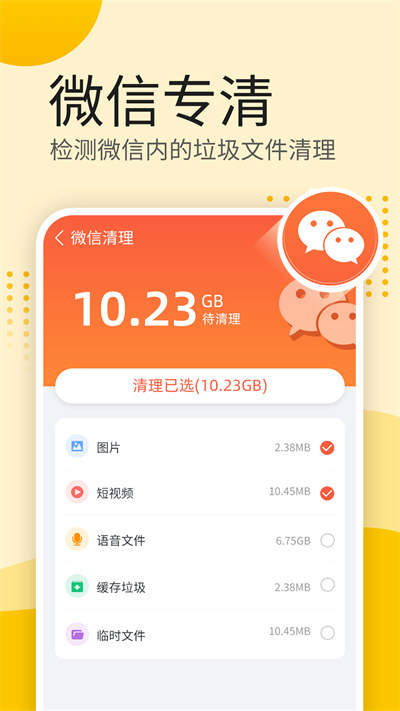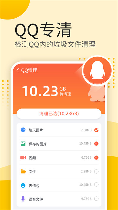 -软件专清,对微信、QQ等软件有专门的清理板块,这些软件里有各种图片、视频、语音垃圾,可以一键清理。