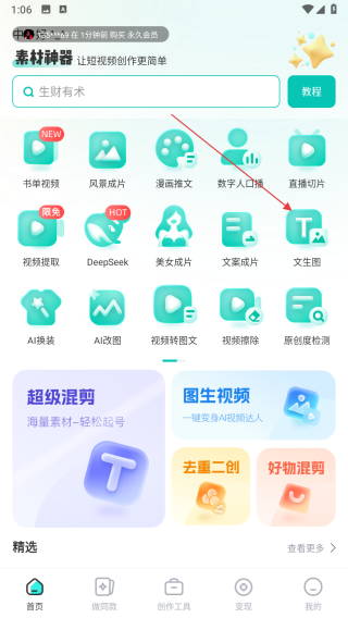 1、打开素材神器APP,在首页点击文生图功能图标,进入文生图创作界面。