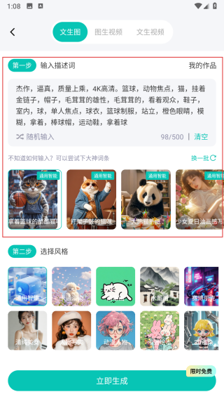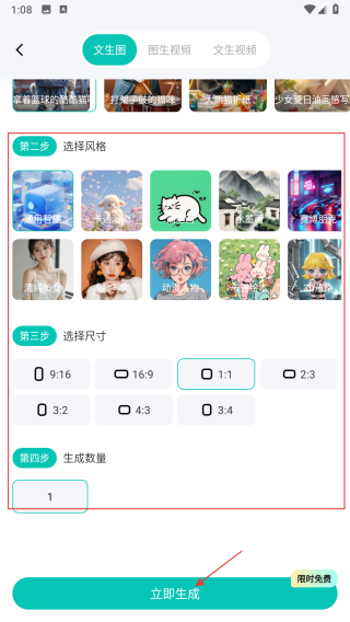 3、在选择风格区域挑选风格,在选择尺寸,设置生成数量,完成所有设置后,点击立即生成按钮。