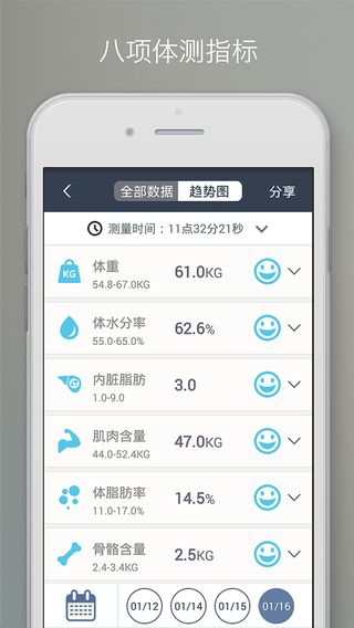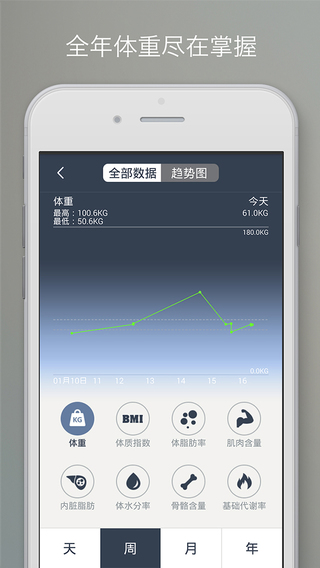 【体质数据简报】 精确记录多达8项身体指数信息,无线同步数据到app中,给出合理的建议。