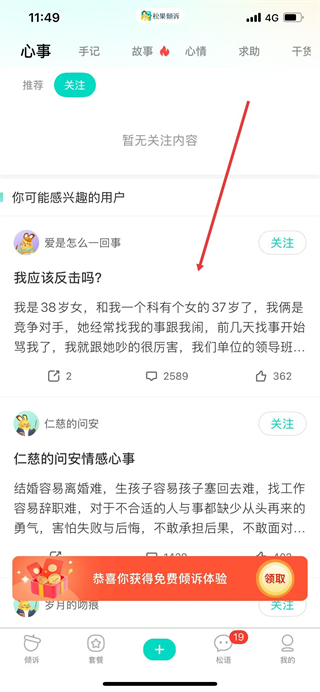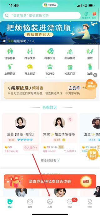 1、打开松果倾诉APP,点击底部导航栏的心事选项。