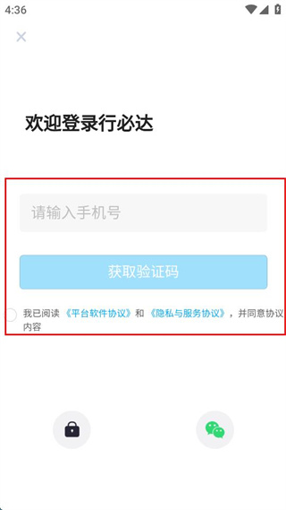 4、在登录界面中,输入手机号,点击获取验证码,勾选相关协议内容。