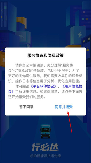 1、打开行必达软件,找到服务协议和隐私政策弹窗,点击同意并接受按钮。