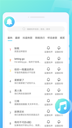 1、一键设置,更新铃声每天实时获取资源,各种铃声可供选择;