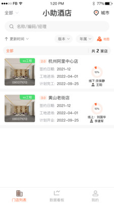 3、列表模式展示门店状态、编号、版本、签约日期、门店进度、工程经理等信息,都能查询。