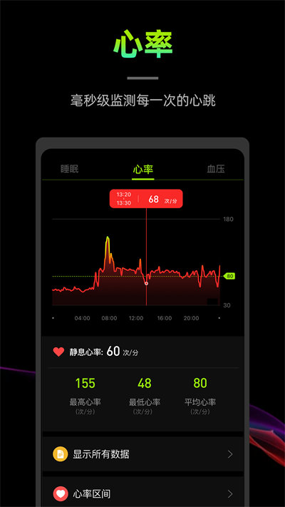 -心率检测,在运动的同时检测心率,能够辅助用户健康的运动,在心率过高时调整自己的运动状态。