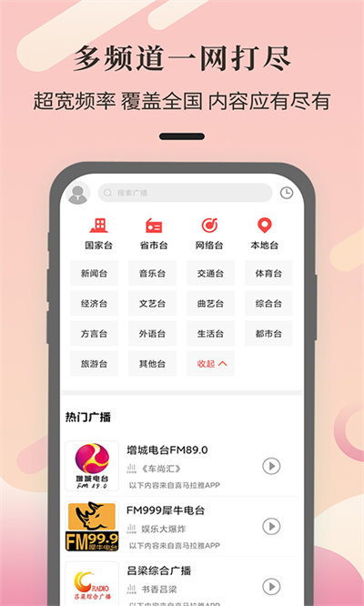 跑火车电台app是一款免费收听全国广播电台的软件,软件能够满足用户的各种听觉需求,高清播放电台节目,非常流畅不卡顿,可以随意切换不同的节目,找到自己喜欢的进行聆听,各种内容在其中都能找到,包括热门电台、音乐、新闻、交通讯息等。