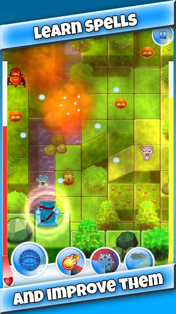 游戏场景非常类似吃豆人,玩家操纵一个小巫师在地图中寻找宝藏同时躲避小怪物的攻击,不过别怕,巫师也有自带技能,可以发射冰冻雪球,喷射炙热的火焰,多种酷炫的技能帮你在游戏中尽情探索。游戏操作非常简单上下左右控制人物,技能快捷键都在游戏下方,点击按钮直接发射,非常容易上手。