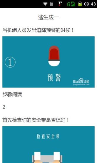 锁飞机失事自救指南app是一款介绍搭乘飞机必备的逃生技能,以防在发生意外状况的时候你惊慌失措,为了应对未知的风险,快下载它来看一看这些必备知识吧!