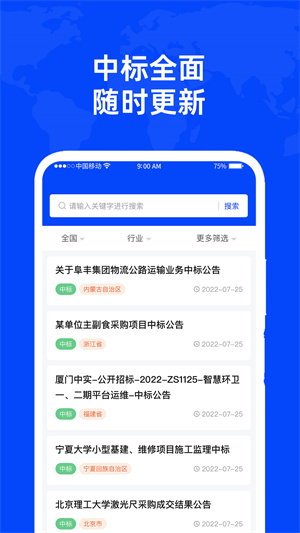 - 可以查询各类招标信息,为您带来最详细的介绍,带给您轻松处理招标事宜的功能。