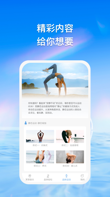 2、这里不仅有音乐还有一些简单的运动项目,让大家相结合,更好的进行放松;