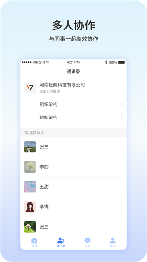 - 提供免费的创业学习材料和可靠的在线服务,公司里每个人的通讯录详细的显示。