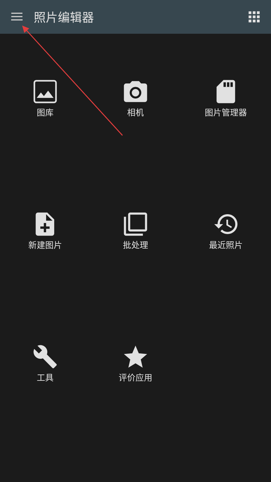 1、打开照片编辑器应用,点击界面左上角的三条横线菜单图标,展开侧边功能栏。